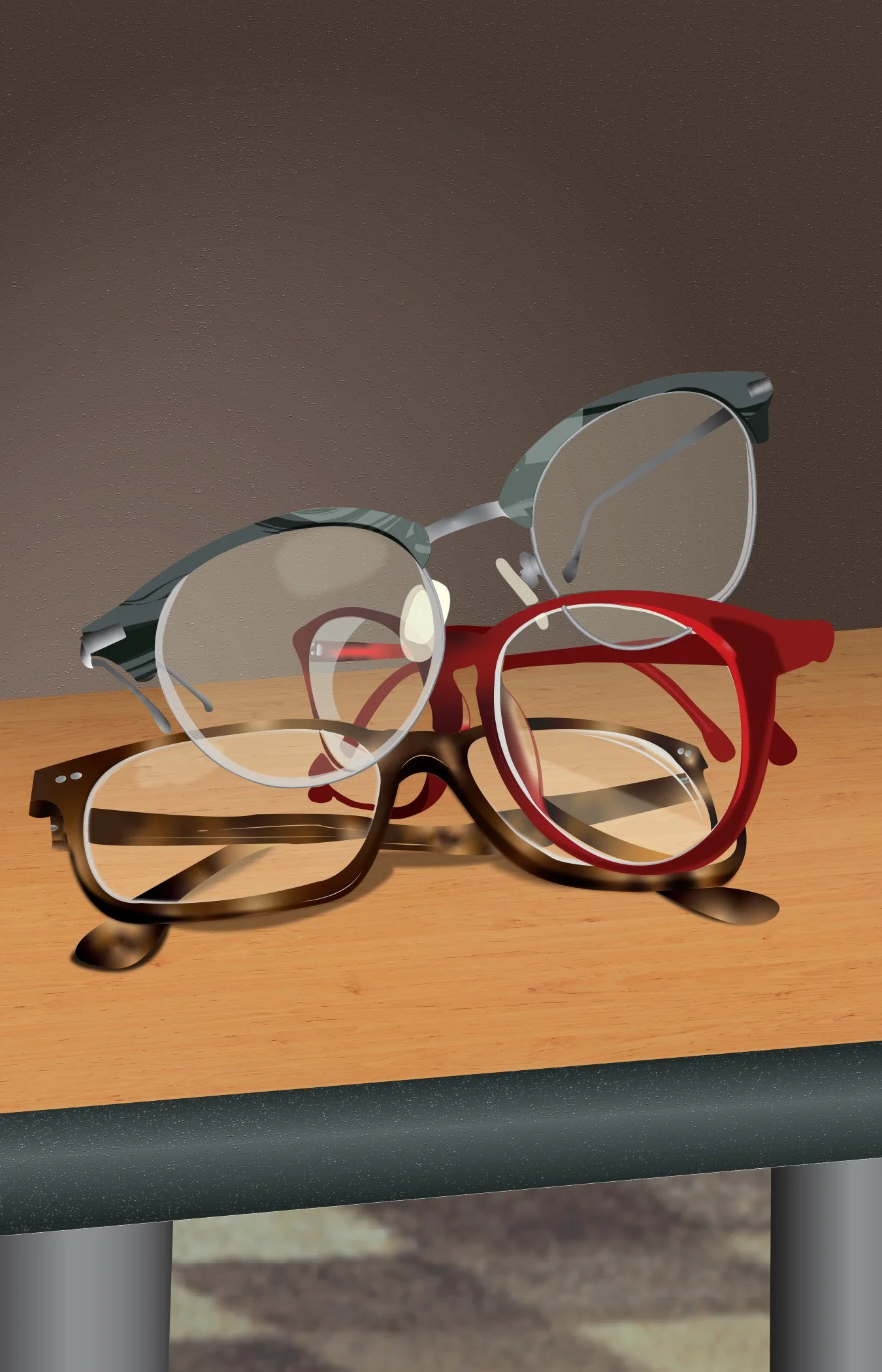 Digital Still Life was completed in Illustrator. Titled "Four Eyes," displays a stack of glasses interpreted through the lens of Adobe Illustrator.